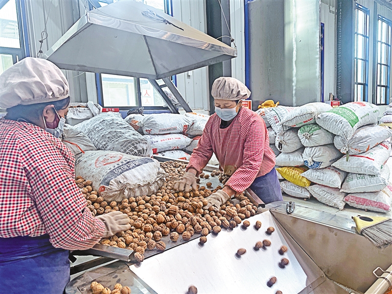 圖為工人們?cè)谔暨x野生山核桃油的原料—核桃。