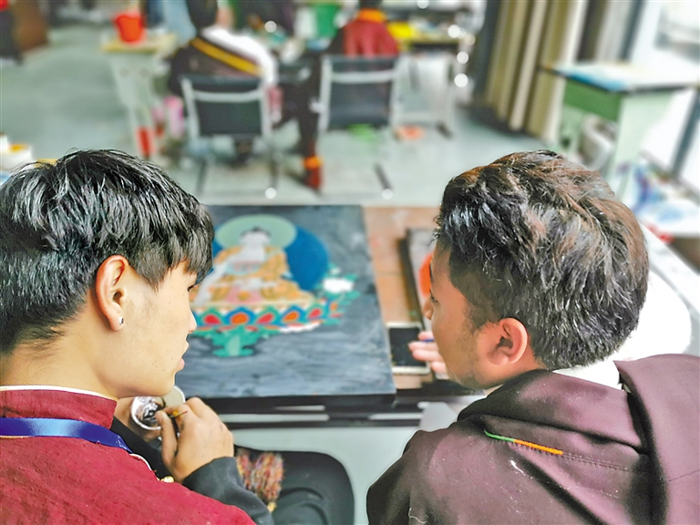 圖為唐卡畫師在交流唐卡漆畫創(chuàng)作技巧。