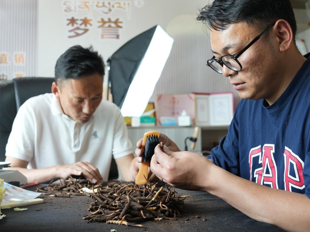 羅拉(右)在公司內(nèi)清潔新鮮蟲草(5月31日攝)。新華社記者丁汀 攝