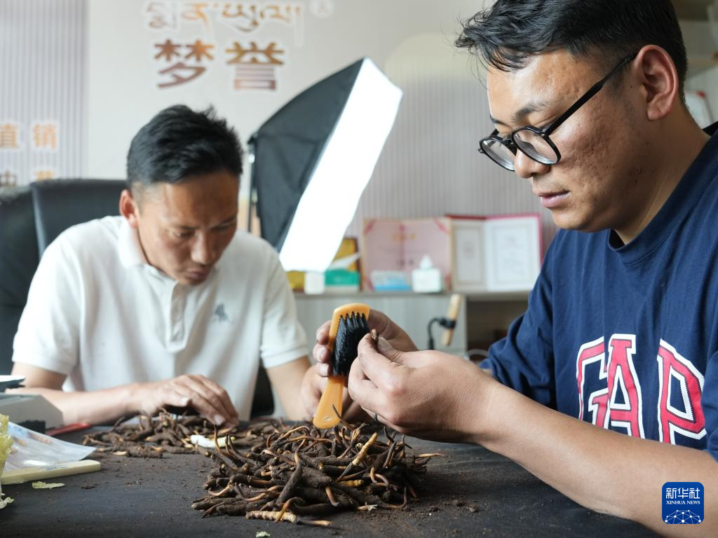 5月31日,在西藏拉薩市,藏族青年羅拉在公司內(nèi)清潔新鮮蟲草。新華社記者 丁汀 攝