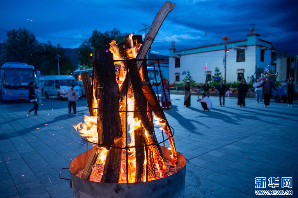 6月24日,游客在扎西曲登社區(qū)廣場體驗(yàn)篝火廣場舞。新華網(wǎng) 旦增努布 攝