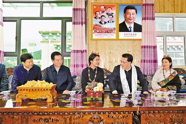 7月8日至10日,重慶市代表團(tuán)來(lái)藏考察。這是代表團(tuán)在昌都市類烏齊縣扎西貢村美麗鄉(xiāng)村示范點(diǎn)與基層群眾親切交流。 記者 旦增西旦 攝
