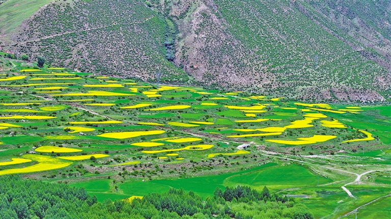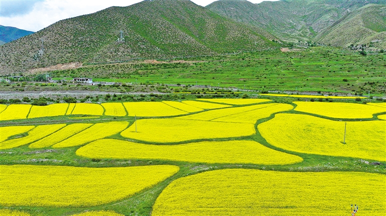 最近,墨竹工卡縣迎來了油菜花的盛開時節(jié)。放眼望去,滿目的油菜花如同金黃色的毯子般鋪展開來,在微風(fēng)中搖曳,散發(fā)出迷人的香氣。一團(tuán)團(tuán)、一簇簇的金黃色花朵點綴在田野上,流動著濃濃夏意。成片的花海與蜿蜒的農(nóng)村公路、錯落有致的村居共同構(gòu)成了一幅和諧美麗的田園風(fēng)景圖。
