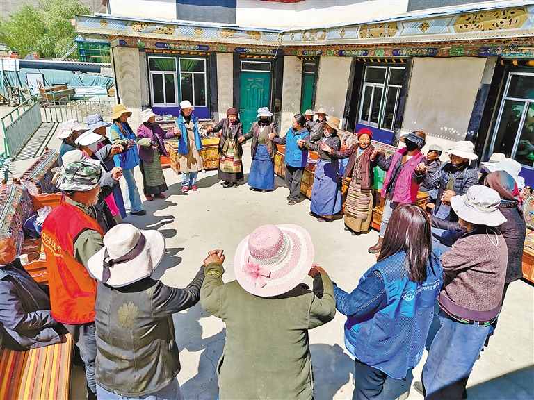 老人積極參與滾瓶水果挑戰(zhàn)趣味游戲。記者 次仁片多 攝