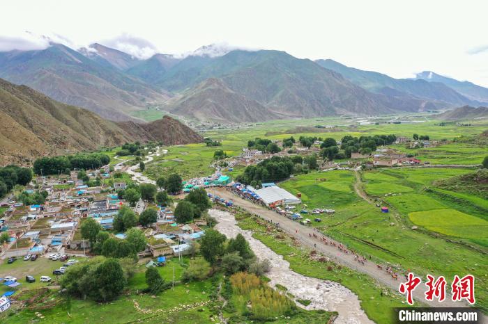 7月21日,西藏自治區(qū)拉薩市堆龍德慶區(qū)馬鎮(zhèn)朗巴村民眾賽馬歡度“望果節(jié)”?!巴?jié)”民俗已有1500多年的歷史,是國家級非物質(zhì)文化遺產(chǎn)。圖為賽馬比賽現(xiàn)場。(無人機(jī)照片)中新社記者 貢嘎來松 攝