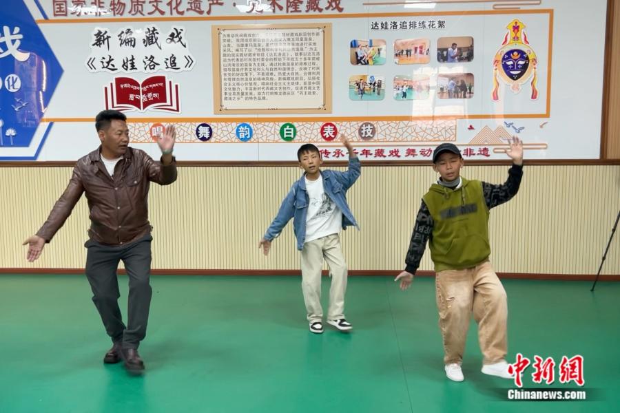 洛桑扎西現(xiàn)場指導(dǎo)藏戲小學員洛桑(右一)。 中新網(wǎng)記者 陳文韜 攝