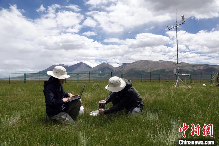 中國(guó)科學(xué)院申扎高寒草原與濕地生態(tài)系統(tǒng)觀測(cè)試驗(yàn)站(申扎站)高寒濕地觀測(cè)試驗(yàn)場(chǎng),科研人員采集相關(guān)觀測(cè)數(shù)據(jù)。中新網(wǎng)記者孫自法攝