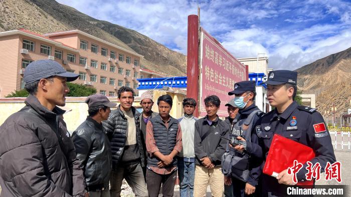 圖為普蘭邊檢民警向中尼邊民普及防災防汛知識。鐘悅祺 攝