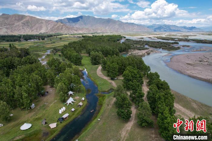 8月11日,人們?cè)诶_市林周縣神秘樹(shù)林搭帳篷“過(guò)林卡”。(航拍畫面)中新社記者 江飛波 攝