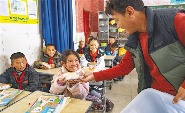 西藏那曲市班戈縣中石化小學是目前全國海拔最高的援藏小學,由中石化集團結對幫扶建立,2012年投入使用。圖為班戈縣中石化小學后勤副校長尼旦為學生們分發(fā)營養(yǎng)餐(資料圖片)。新華社記者 丁增尼達 攝