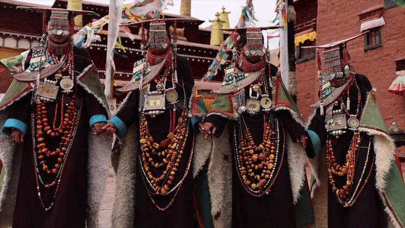 普蘭縣科迦村里有7戶人家保存著7套祖?zhèn)鞣?,一套重達(dá)25公斤,裝飾有黃金、白銀、松石、瑪瑙、珊瑚、珍珠等,承載和沉淀了百年時(shí)光,堪稱“穿在身上的千年史”。