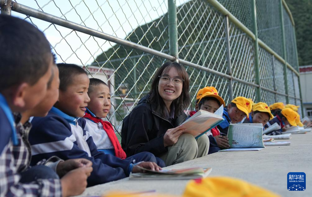 在娘蒲鄉(xiāng)中心小學,嶺南師范學院支教隊隊員胡正培和學生互動教學(9月3日攝)。新華社記者 晉美多吉 攝