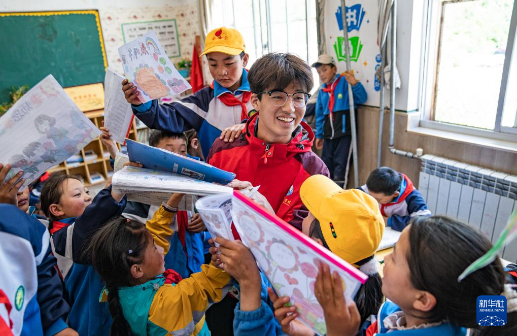 在娘蒲鄉(xiāng)中心小學,孩子們把自己做好的手抄報展示給胡正培(9月3日攝)。新華社記者 丁增尼達 攝