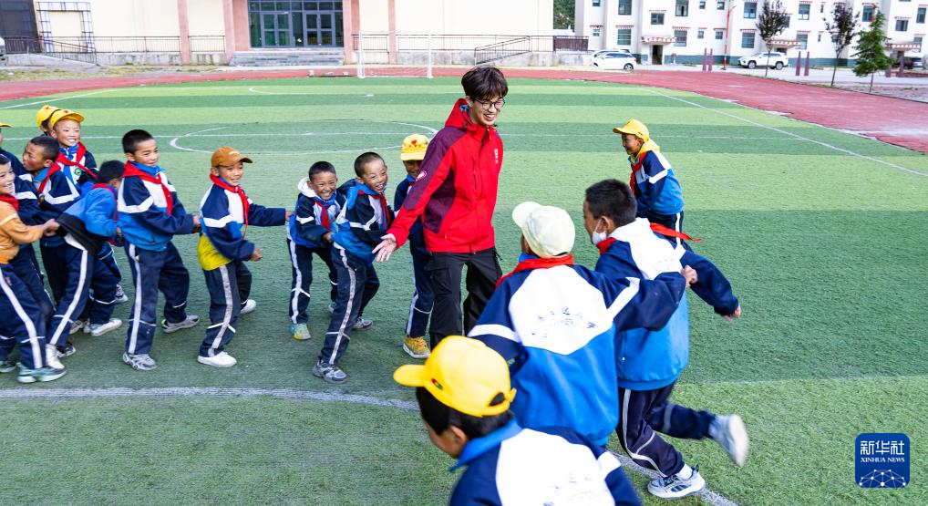 在娘蒲鄉(xiāng)中心小學,嶺南師范學院支教隊成員胡正培課間與孩子們玩耍(9月3日攝)。新華社記者 丁增尼達 攝