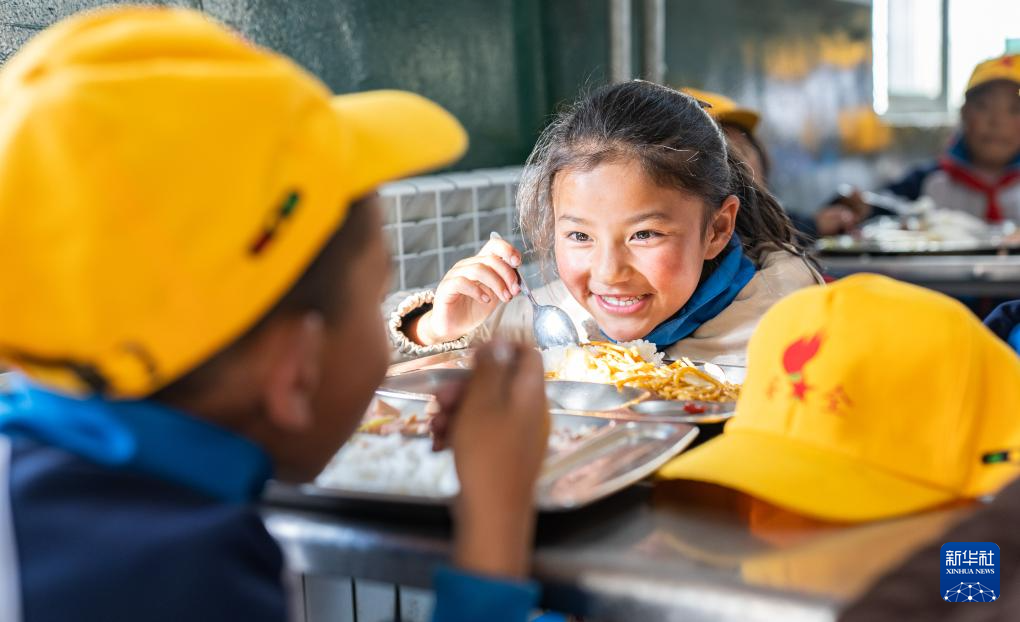 娘蒲鄉(xiāng)中心小學的學生在食堂用餐(9月3日攝)。新華社記者 丁增尼達 攝