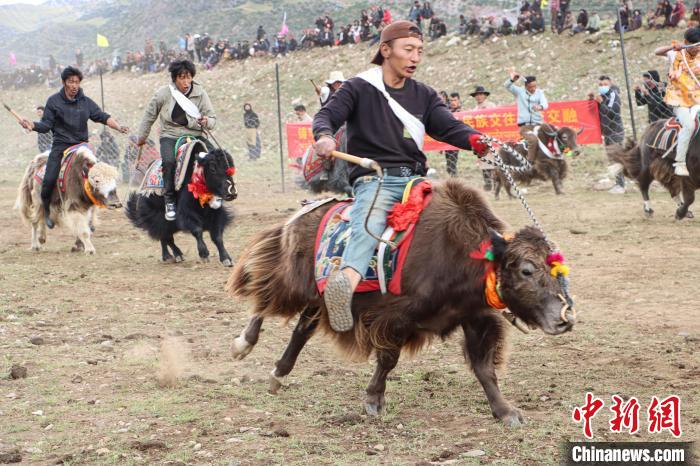 賽牦?;顒?dòng)現(xiàn)場(chǎng),牧民將自家的牦牛精心打扮,信心滿滿地走上起跑線,一聲令響,眾騎手驅(qū)牛疾馳?,F(xiàn)場(chǎng)呼聲陣陣,高潮迭起,為每一頭疾馳的牦牛加油歡呼。
