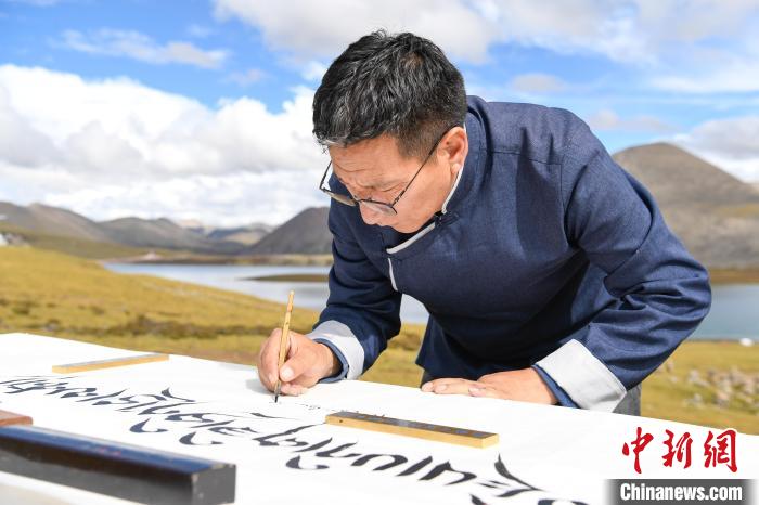 圖為書(shū)法家在思金拉措湖邊用藏文書(shū)寫(xiě)“思金拉措”。貢嘎來(lái)松 攝