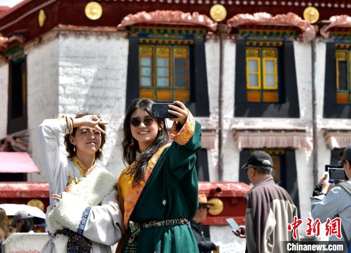 圖為9月7日游客在八廓街拍攝藏服寫真。中新社記者 李林 攝