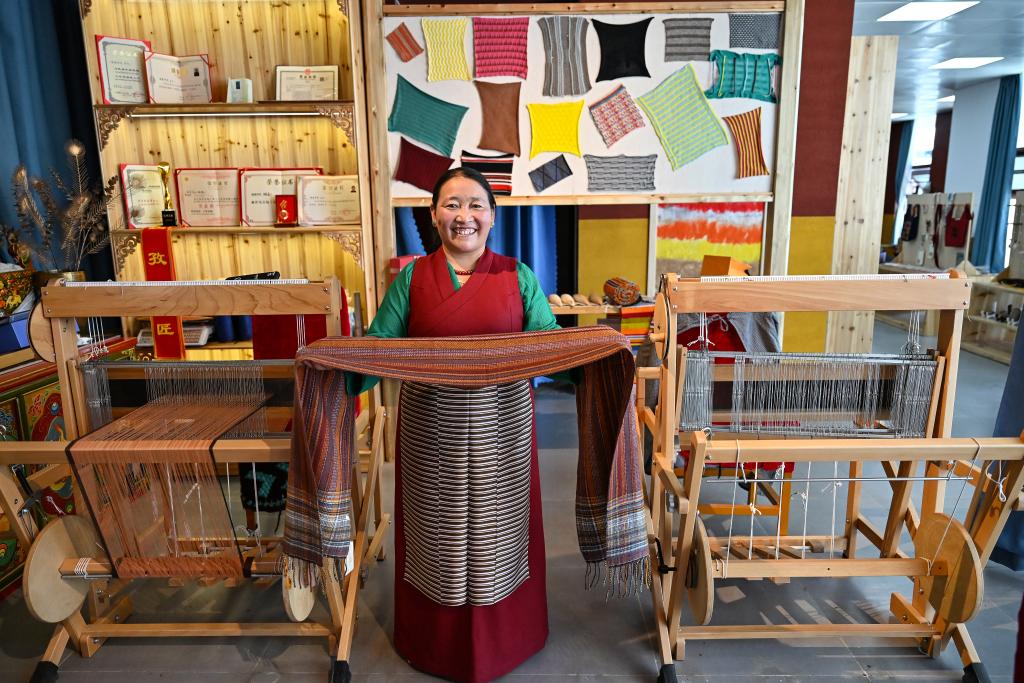 9月3日,格桑卓瑪在工坊展示羊絨氆氌圍巾。新華社記者孫瑞博 攝