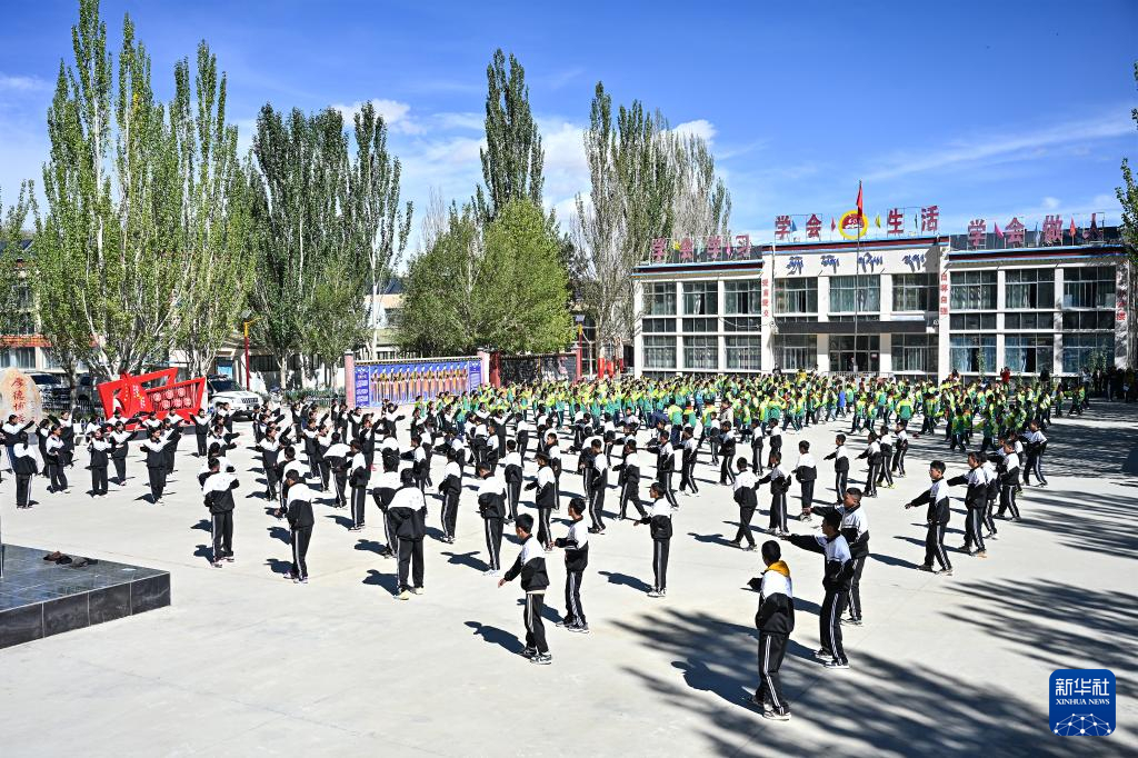 在西藏阿里地區(qū)札達縣九年一貫制學校,孩子們跳起融入國家級非物質文化遺產(chǎn)“宣舞”特色的課間操(9月10日攝)。新華社記者 孫瑞博 攝