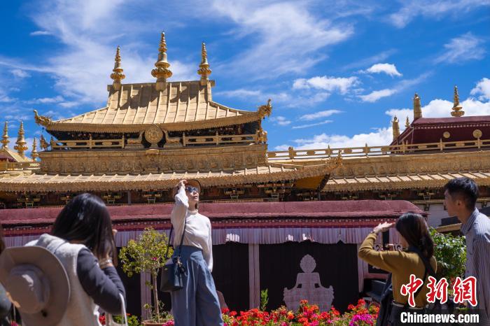 9月17日,游客在西藏拉薩大昭寺金頂前留影。中秋佳節(jié),距今已有1300多年歷史、2000年作為布達拉宮擴展項目列入《世界遺產(chǎn)名錄》的拉薩大昭寺迎來眾多游客。中新社記者 貢嘎來松 攝