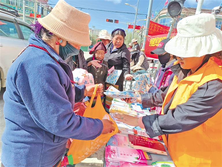 圖為薩迦縣民族團(tuán)結(jié)進(jìn)步宣傳活動(dòng)月啟動(dòng)儀式上,工作人員發(fā)放宣傳冊(cè)。