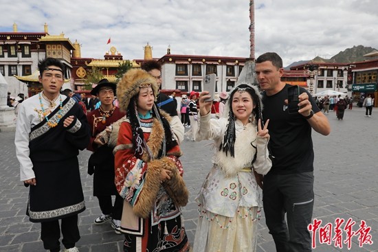 9月2日,西藏拉薩市八廓街,來自俄羅斯的巴德里(右一)與身穿藏族傳統(tǒng)服裝的年輕游客合影留念。近年來,來拉薩旅游,到八廓街、布達(dá)拉宮廣場拍一套藏服寫真,已經(jīng)成為進(jìn)藏旅游年輕人的“標(biāo)配”。中青報(bào)·中青網(wǎng)記者 孔斯琪/攝