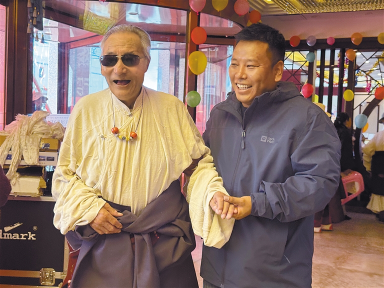 尼瑪是國(guó)家級(jí)非物質(zhì)文化遺產(chǎn)代表性項(xiàng)目卓舞(瓊結(jié)久河卓舞)國(guó)家級(jí)代表性傳承人。演出中,他擔(dān)任“卓本”(領(lǐng)舞者)角色,協(xié)調(diào)整個(gè)團(tuán)隊(duì)11人的舞蹈動(dòng)作和節(jié)奏?!拔矣H歷西藏翻天覆地的變化,看到如今的盛世,叫我們?cè)跄懿桓璩 泵鎸?duì)人們對(duì)他不顧年事“執(zhí)著”舞臺(tái)的疑問(wèn)和驚嘆,尼瑪感嘆道。