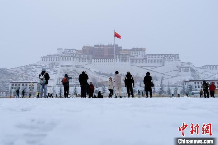 資料圖為2024年1月18日,拉薩迎來降雪天氣,游客在拉薩布達(dá)拉宮廣場(chǎng)合影留念。江飛波 攝