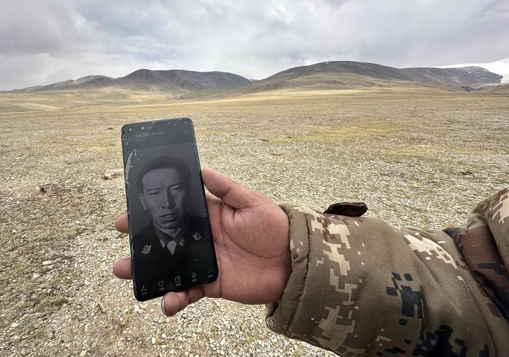 2024年6月15日,在西藏那曲市尼瑪縣境內(nèi)的羌塘國(guó)家級(jí)自然保護(hù)區(qū)“無(wú)人區(qū)”深處,格桑倫珠向記者展示他手機(jī)中珍藏的羅布玉杰的照片。新華社記者費(fèi)茂華攝