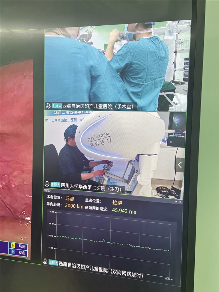 梅玲介紹,此次手術(shù)是與四川大學(xué)華西第二醫(yī)院聯(lián)合開展的,由四川大學(xué)華西第二醫(yī)院的鄭瑩教授團(tuán)隊(duì)主刀,并依托華西的先進(jìn)技術(shù)平臺(tái),通過遠(yuǎn)程方式完成手術(shù)。手術(shù)結(jié)束后,鄭瑩教授通過視頻向大家介紹,這場跨越2000公里距離與3000米海拔差異的手術(shù),總共用時(shí)1小時(shí)45分鐘,網(wǎng)絡(luò)延遲僅40毫秒?!按舜问中g(shù)的成功為今后更多優(yōu)質(zhì)資源技術(shù)送達(dá)偏遠(yuǎn)地區(qū)提供了重要參考,也為提高西藏醫(yī)療水平打下了堅(jiān)實(shí)的基礎(chǔ)。”鄭瑩說。