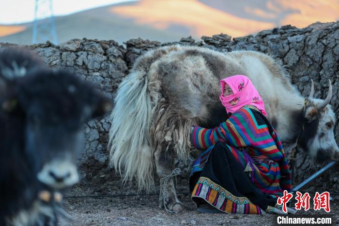 12月12日,西藏自治區(qū)那曲市安多縣帕那鎮(zhèn)牧民土巴卓瑪正準(zhǔn)備擠牦牛奶。帕那鎮(zhèn)位于安多縣中部,是安多縣人民政府所在地,下轄3個村,3個居民委員會,12個自然村,7個居民小區(qū)。青藏鐵路、青藏公路貫穿全境,交通便利,牛羊成群,景色宜人。中新社記者 貢嘎來松 攝
