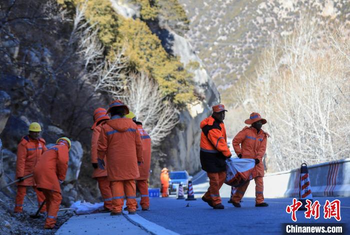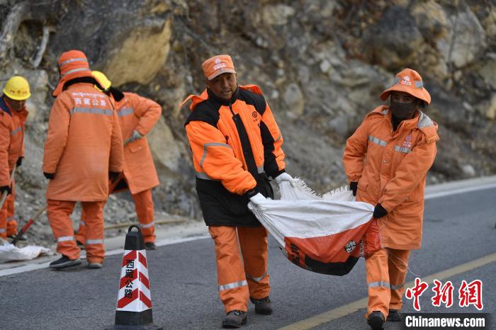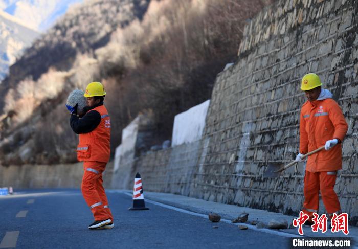 12月16日,西藏自治區(qū)林芝公路事業(yè)發(fā)展和應(yīng)急保障中心(工布江達(dá)養(yǎng)護(hù)段)道路養(yǎng)護(hù)工人及時(shí)清除川藏公路上的落石,保障道路暢通。該養(yǎng)護(hù)段擔(dān)負(fù)著川藏公路沿線工布江達(dá)縣路段的養(yǎng)護(hù)管理、應(yīng)急搶險(xiǎn)等工作,包括路面修補(bǔ)、清理邊溝、維護(hù)交通安全設(shè)施等日常養(yǎng)護(hù)工作。圖為養(yǎng)護(hù)工人在公路上巡護(hù)。中新社記者 薛蒂 攝