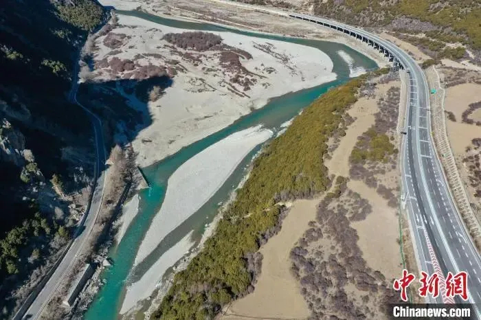 圖為部分養(yǎng)護(hù)路段(右)。(無(wú)人機(jī)照片)中新社記者 貢嘎來(lái)松 攝
