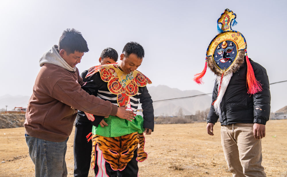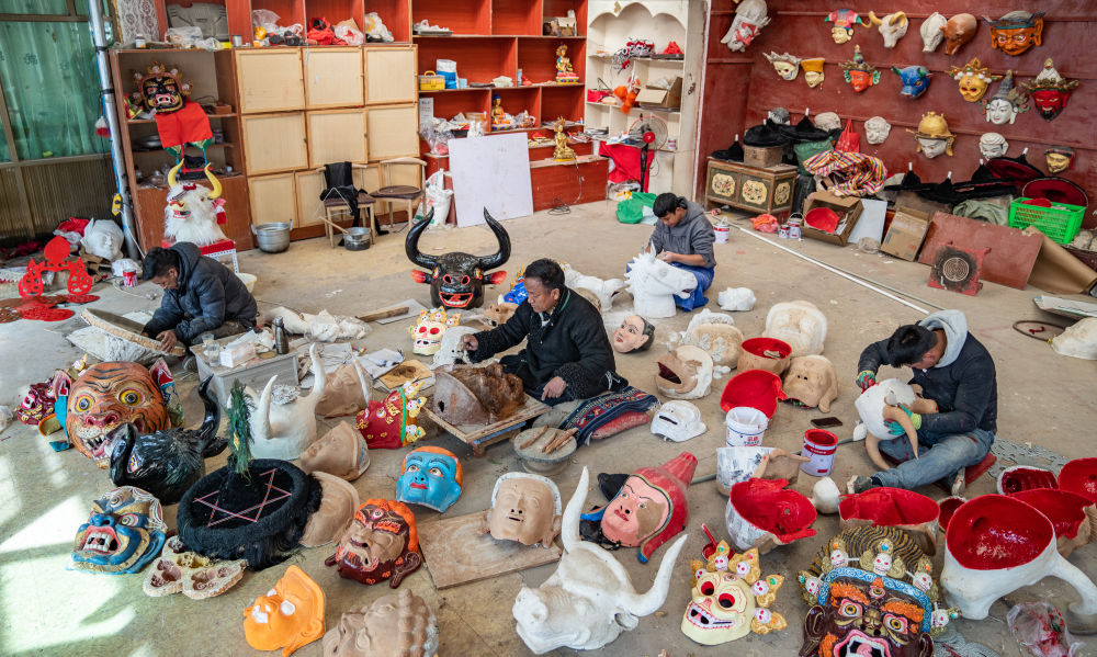 拉薩達(dá)孜區(qū)雪鄉(xiāng)民間傳統(tǒng)手工藝農(nóng)民專業(yè)合作社的工匠在合作社門前的空地上佩戴檢查做好的西藏傳統(tǒng)面具。
