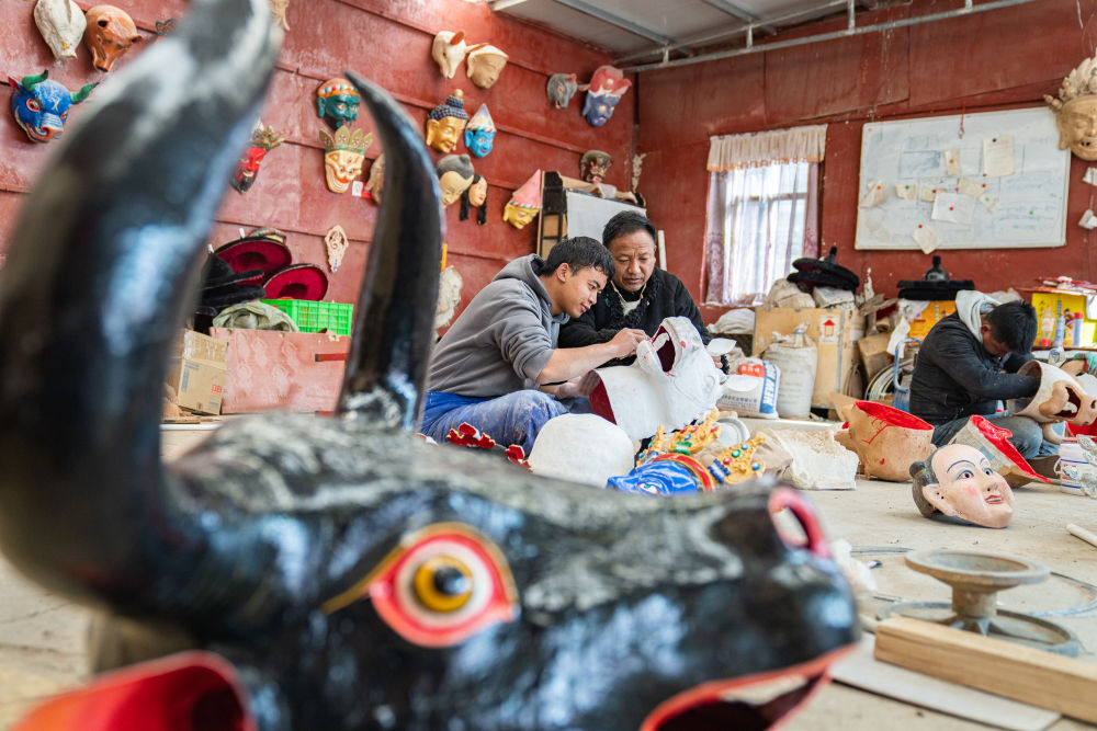 拉薩布制面具制作技藝西藏自治區(qū)級(jí)非遺傳承人西洛(左)和同事交流西藏傳統(tǒng)面具制作心得。