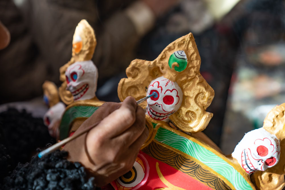 拉薩布制面具制作技藝西藏自治區(qū)級(jí)非遺傳承人西洛(中)和同事交流西藏傳統(tǒng)面具制作心得。