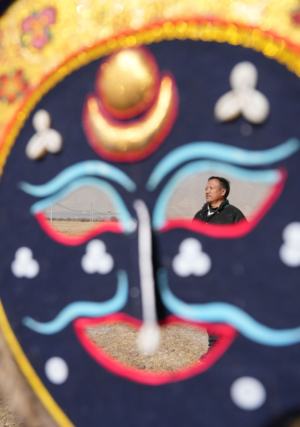 拉薩布制面具制作技藝西藏自治區(qū)級(jí)非遺傳承人西洛在合作社門前的空地上和同事一起檢查做好的西藏傳統(tǒng)面具。