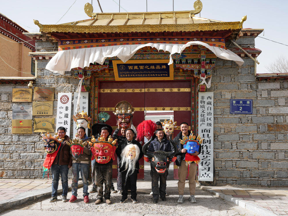拉薩達(dá)孜區(qū)雪鄉(xiāng)民間傳統(tǒng)手工藝農(nóng)民專業(yè)合作社的面具制作工匠們?cè)诤献魃玳T口合影。
