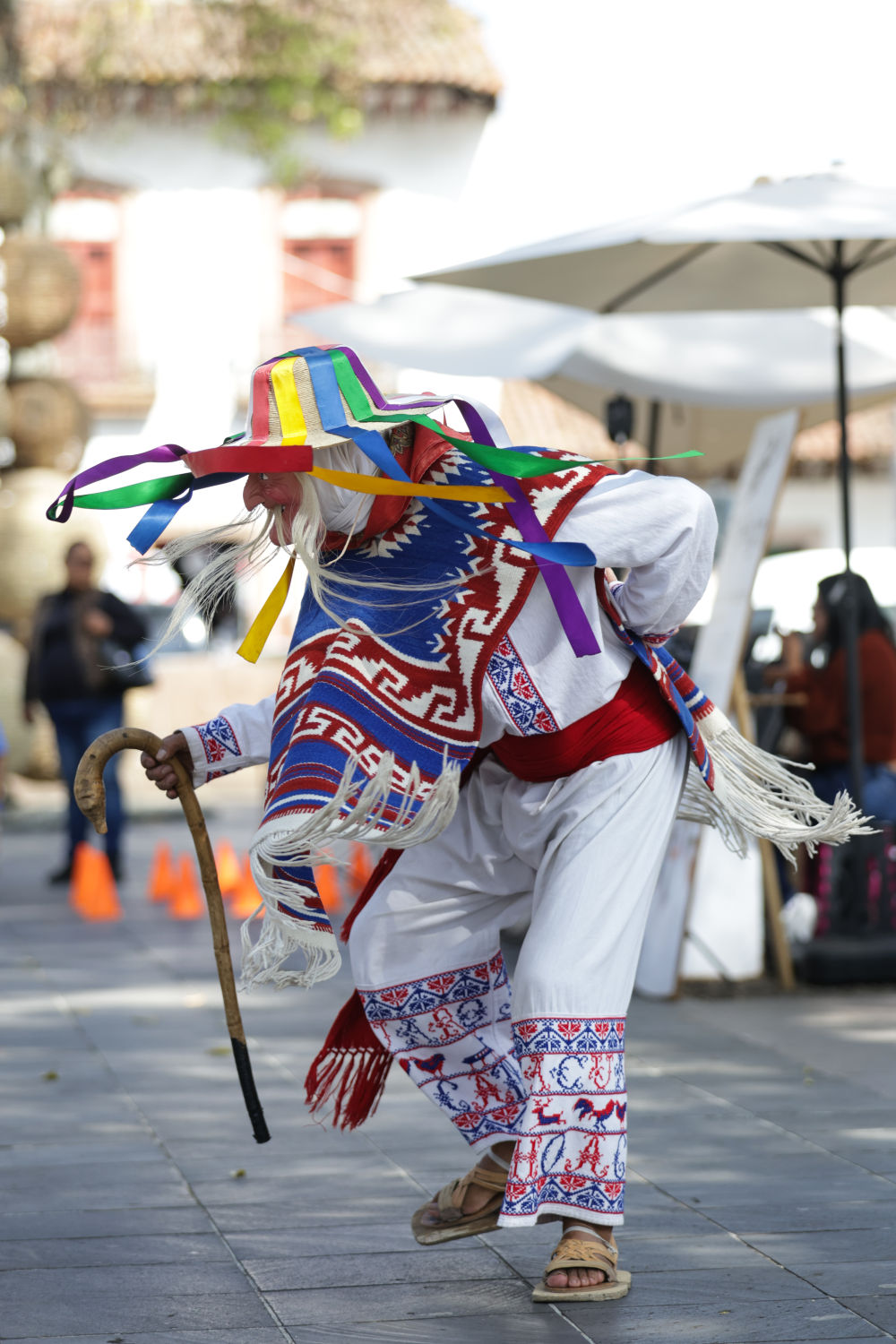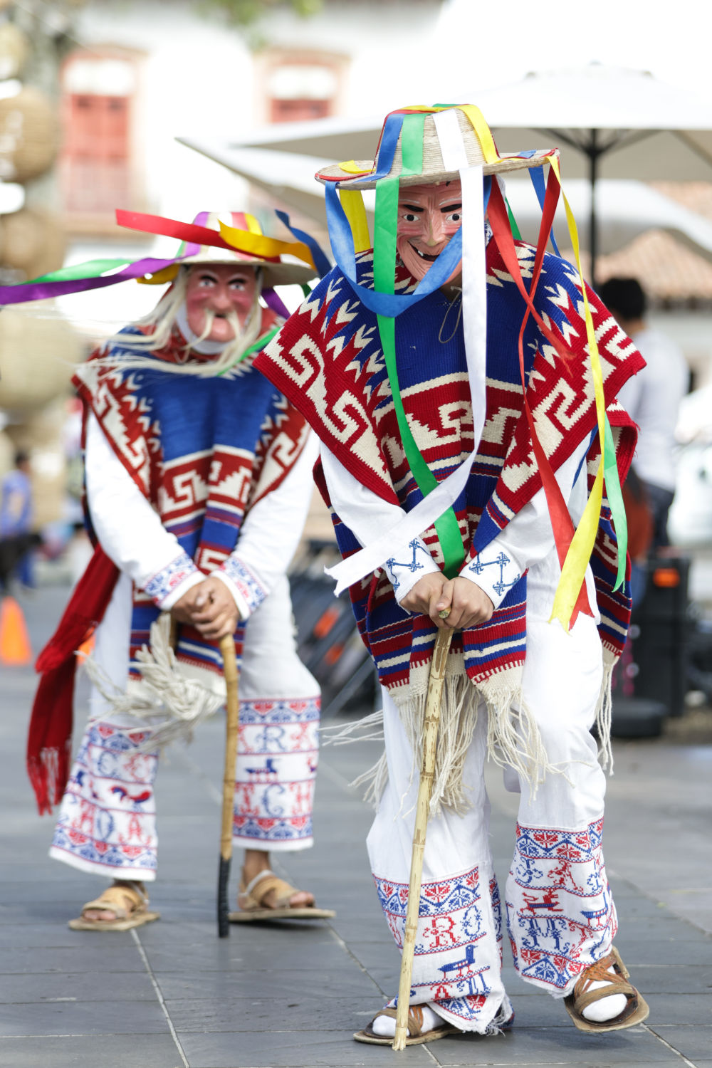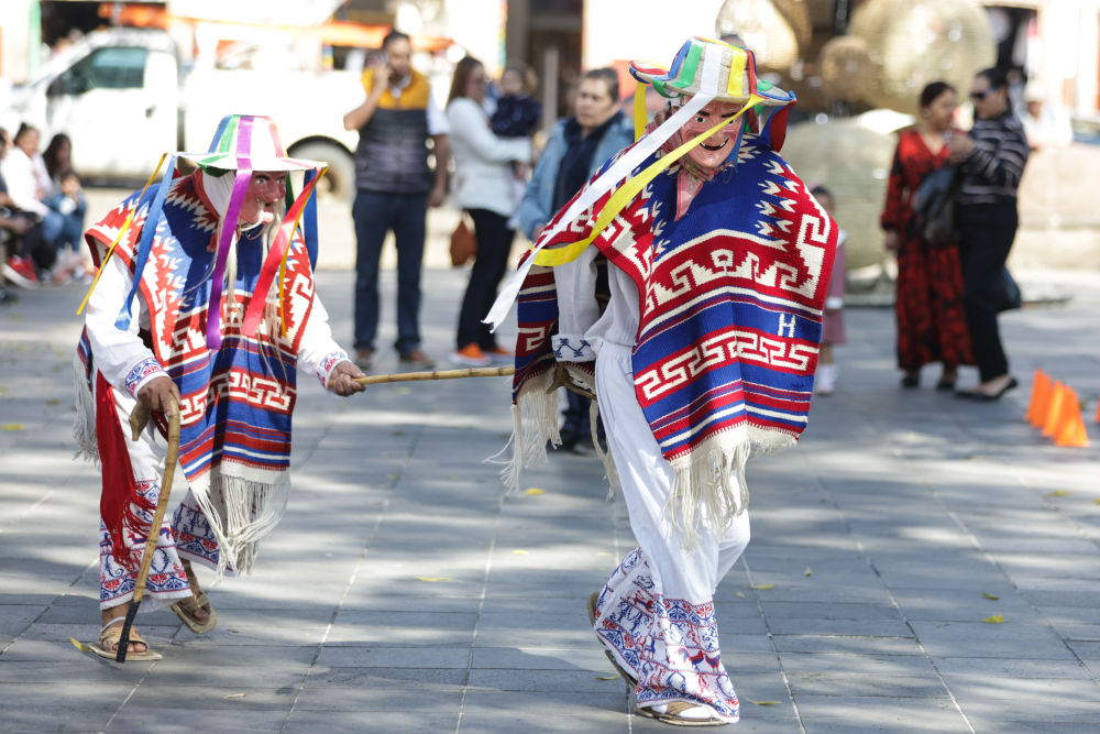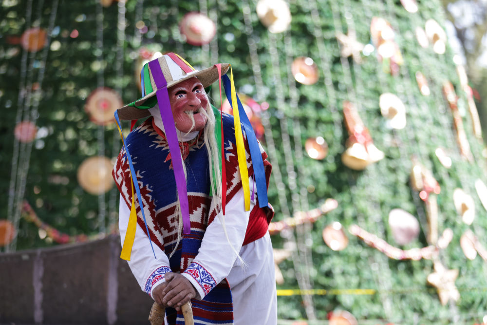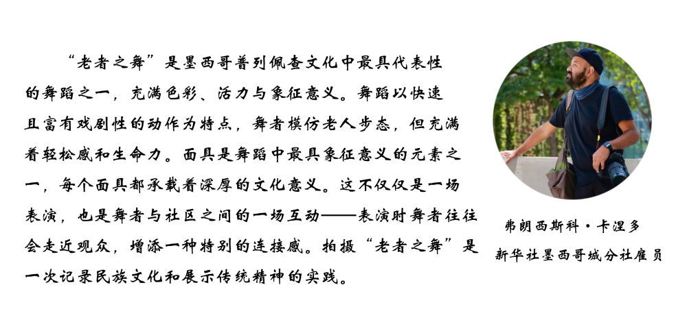 面具制作在墨西哥也有著悠久的歷史,有各式各樣的面具用于各種舞蹈和慶典。舞者表演“老者之舞”時(shí)往往配戴著略顯夸張的面具,面具通常帶有皺紋、胡須和微笑的表情,借以塑造一種看似滑稽、幽默卻充滿智慧的形象。除了老人面具,舞者表演時(shí)還會(huì)穿著傳統(tǒng)的普列佩查民族服飾,包括刺繡彩色披肩、白色農(nóng)民風(fēng)格的長(zhǎng)衫和編織草帽,整體造型鮮艷、喜慶。舞蹈表演時(shí)舞者會(huì)模仿老人的步態(tài),以滑稽的方式彎腰駝背,手持拐杖或木棍,搖搖晃晃地邁步,同時(shí)做出靈活的跳躍和旋轉(zhuǎn)動(dòng)作,展現(xiàn)一種出人意料的活力與生命力。