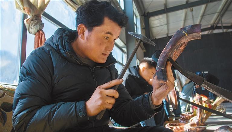 在國家級非遺孜東銅器作坊,工作人員正在制作銅器。