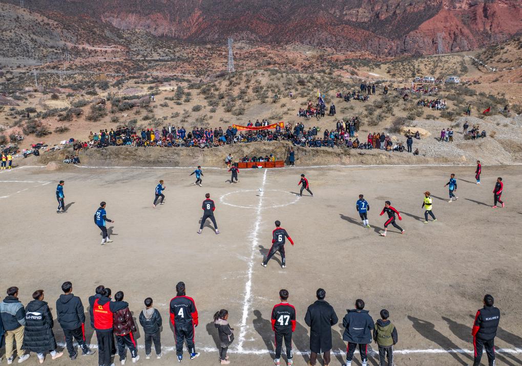 在馬利鎮(zhèn)“云中球場(chǎng)”,幾名球迷趁著球賽間隙踢球玩耍(1月2日攝)。新華社記者 丁增尼達(dá) 攝