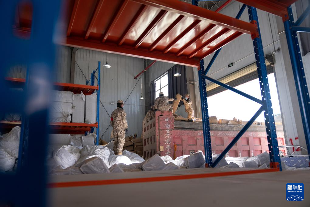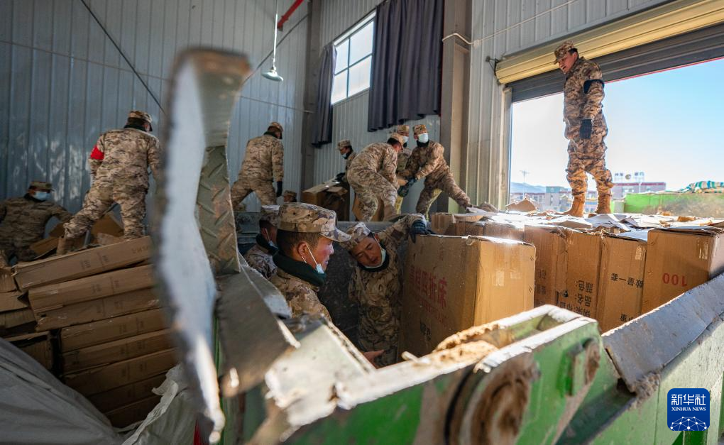 1月8日,在日喀則市經(jīng)開區(qū)物資儲備倉庫,武警官兵在搬運抗震救災物資。新華社記者 丁增尼達 攝