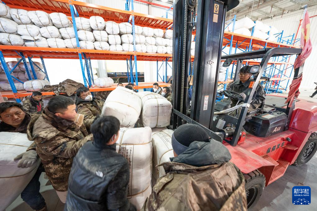 1月8日,在日喀則市經(jīng)開區(qū)物資儲備倉庫,當?shù)馗刹咳罕姲徇\抗震救災物資。新華社記者 丁增尼達 攝