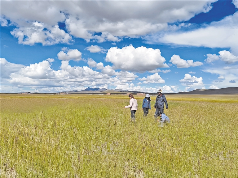 科研人員視察那曲市色尼區(qū)那么切鄉(xiāng)生態(tài)修復(fù)點(diǎn)牧草長(zhǎng)勢(shì)情況。