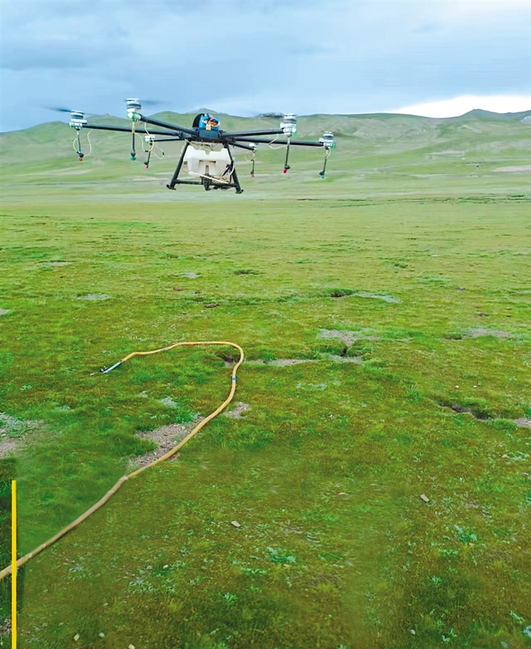 據(jù)介紹,高原毛蟲(chóng)是西藏高原牧區(qū)的重要害蟲(chóng),多發(fā)生在海拔3000至5000米的高山草原,對(duì)莎草科、禾本科、豆科、蓼科、薔薇科等各類(lèi)牧草危害嚴(yán)重,嚴(yán)重影響牧草生長(zhǎng)和畜牧業(yè)的發(fā)展。在項(xiàng)目實(shí)施過(guò)程中,項(xiàng)目組確定使用植保無(wú)人機(jī)噴藥,防治高原毛蟲(chóng)。