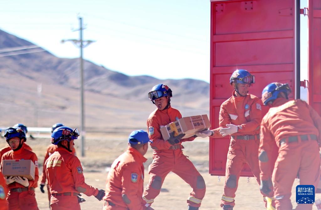 1月9日,救援人員在措布村卸載救災(zāi)物資。新華社記者 姜帆 攝