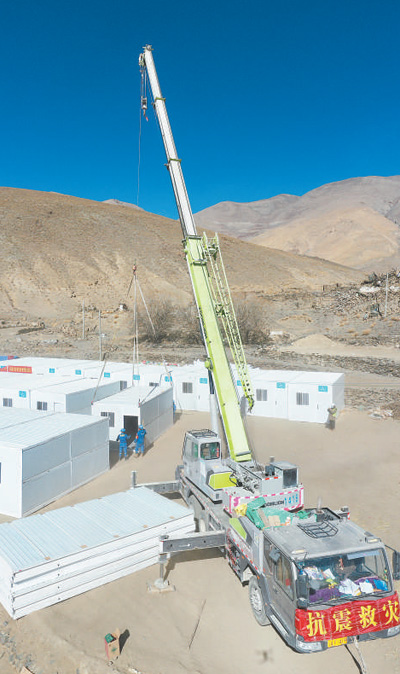 為保障受災(zāi)群眾從應(yīng)急性臨時(shí)安置轉(zhuǎn)為固定性過(guò)渡安置,震后第二天,首批新式折疊板房就運(yùn)抵定日縣。