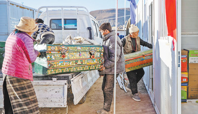 1月11日,西藏定日縣曲洛鄉(xiāng)措昂村,首批入住活動板房的村民正在搬運(yùn)物品,為入住做準(zhǔn)備。記者 張武軍攝