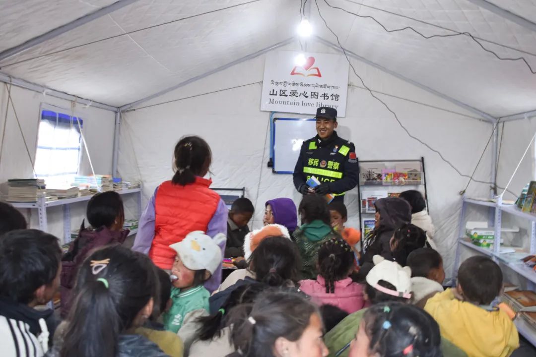 地震發(fā)生后,西藏邊檢總站日喀則邊境管理支隊救援民警不知疲倦地奔走在震中3個受損嚴重的村莊,了解震后群眾生產(chǎn)生活情況,協(xié)助解決面臨的各種困難問題。面對240頂帳篷,230戶1200余名災民,民警們組建了抗震救災雜村、嘎布村和玉白村臨時警務室,配備警力30人,實行24小時勤務模式,主要承擔交通疏導、宣傳教育、隱患排查、秩序維持、輔導功課、協(xié)助地方開展其他救援等任務,同時設置常用藥箱,方便群眾用藥需求,被群眾親切地稱為“建在身邊的派出所”。